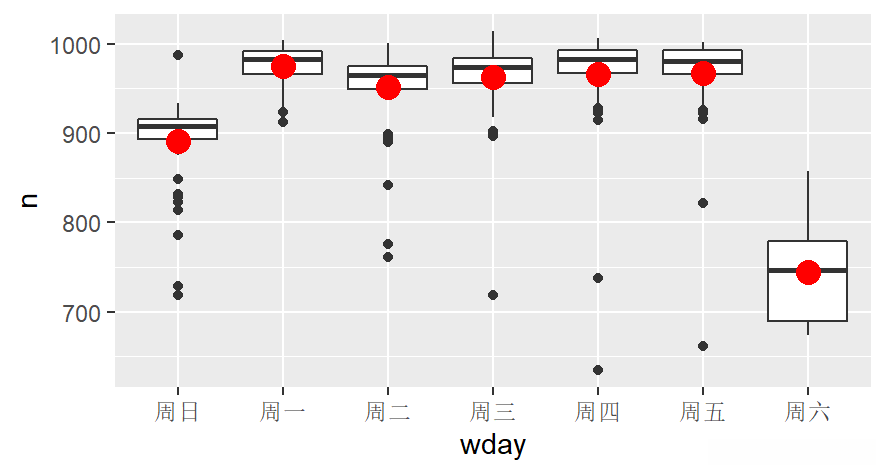 > ggplot(daily,aes(wday,n))+geom_boxplot()+geom_point(data=grid,color='red',size=4)