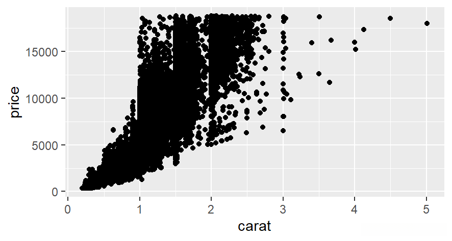 > ggplot(diamonds,aes(carat,price))+geom_point()