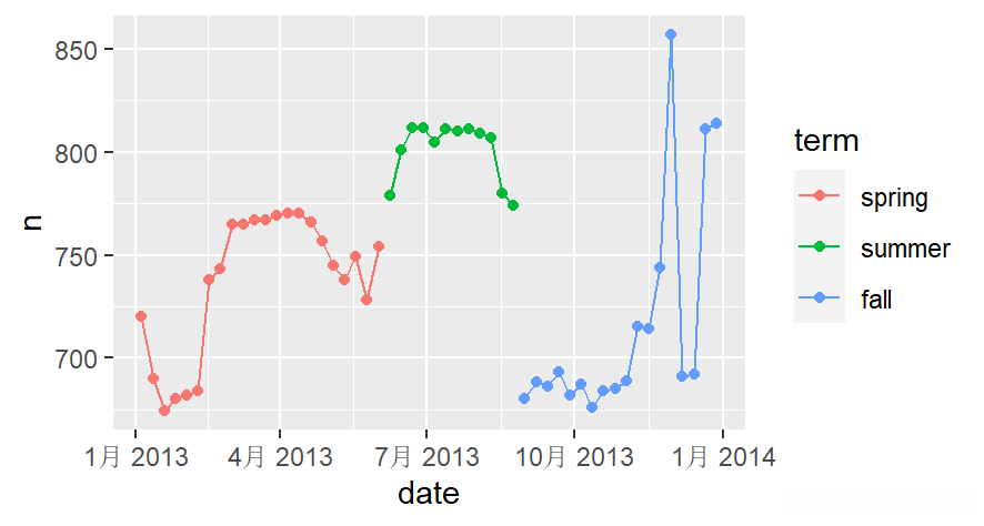 + cut(date,breaks=ymd(20130101,20130605,20130825,20140101),labels=c("spring","summer","fall"))
