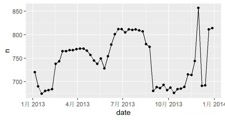 > daily%>%filter(wday=="周六")%>%ggplot(aes(date,n))+geom_point()+geom_line()