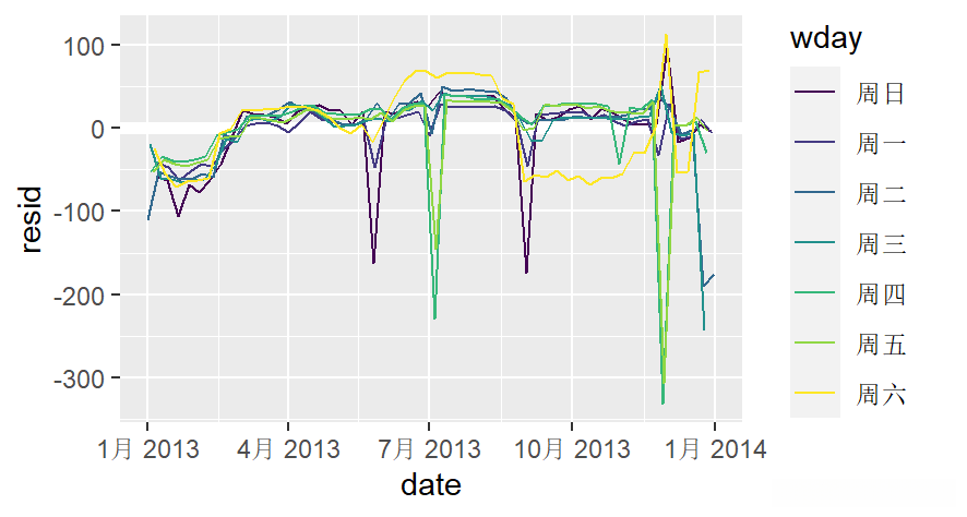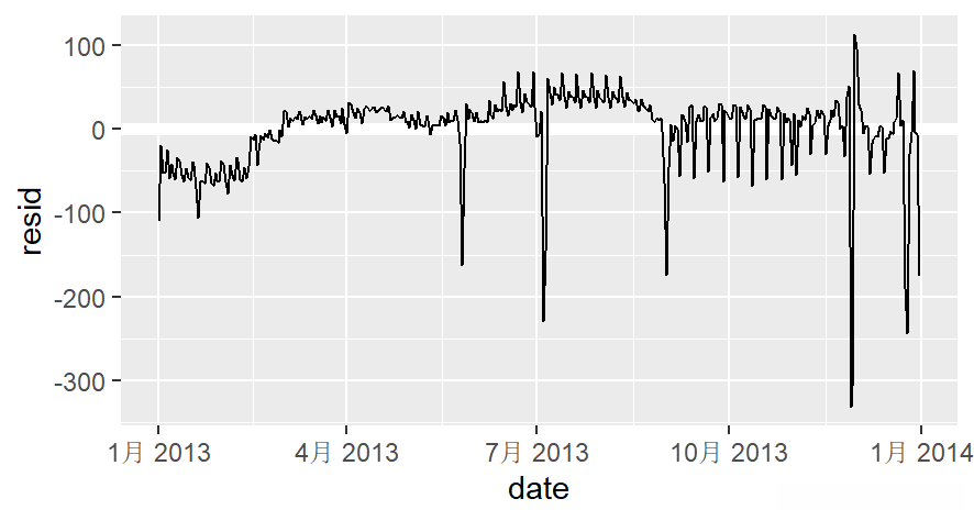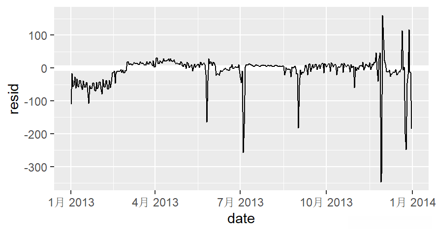 日期与残差的图像已去除绝大多数周内效应。该图片的y轴表示预测值与真实值之间的差异程度。