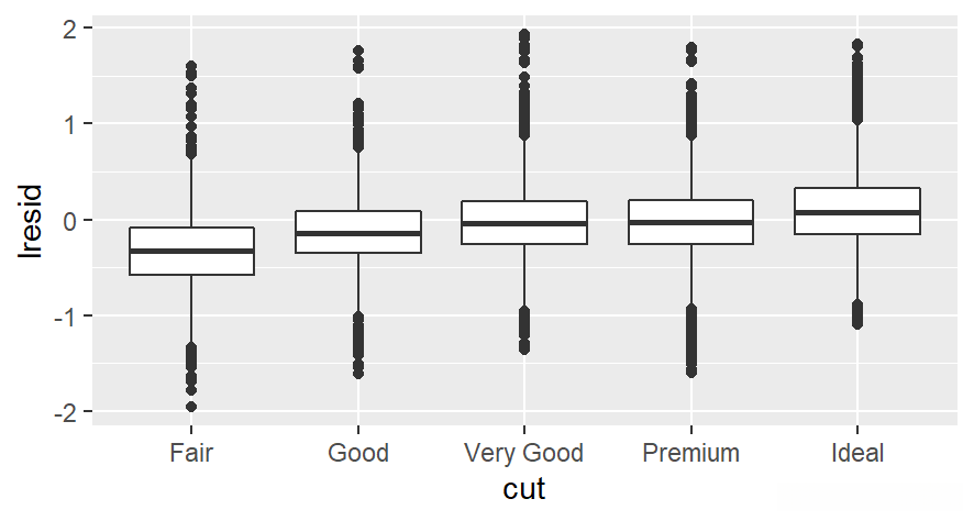 > ggplot(diamonds2,aes(cut,lresid))+geom_boxplot()