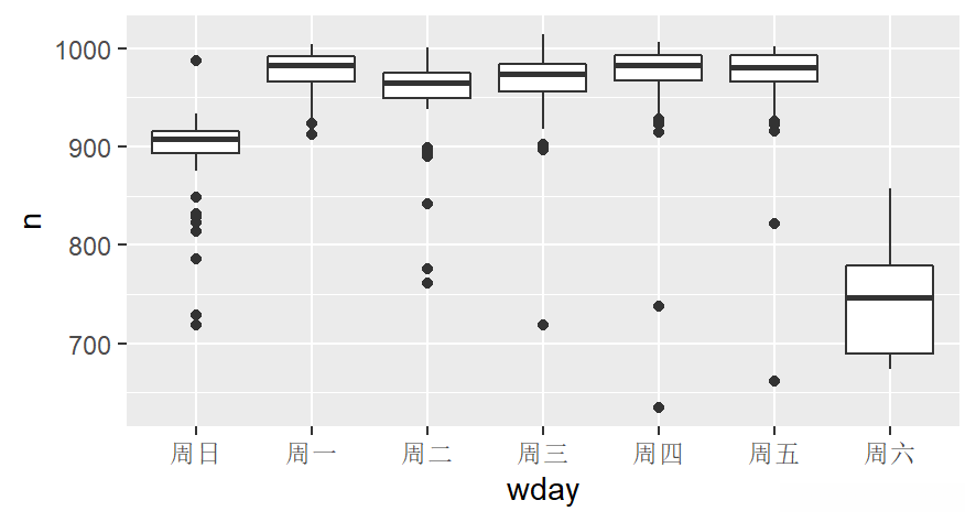 > ggplot(daily,aes(wday,n))+geom_boxplot()