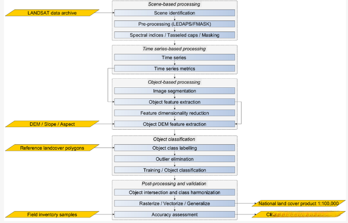 在联合国实施的 REDD 计划中,在估算全国范围内的森林面积时主要依据的是遥感技术获取的土地覆盖数据。考虑到墨西哥作为幅员辽阔的国家的特点,在这一过程中仅凭自动化图像分类技术便能够以标准化且具成本效益的方式及时提供所需信息。本文介绍并详细探讨了墨西哥实用的土地覆被监测系统(Landsat Land Cover Monitoring System)。该系统通过整合国家尺度地图基准数据、所有可用 Landsat 卫星图像以及实地调查数据进行了内部验证工作。研究发现该系统自 1993 年至 2008 年间每年都能生成一张年度全国土地覆被图共计七幅图谱,并采用层次化分类方法将地形地貌划分为 9 个类别及 12 个子类别。经过评估后发现总体准确率达到 76% ,其中热带雨林区域的表现尤为突出其分类准确率高达 78% 而温带森林地区的准确率则更高达 82% 。尽管该监测系统是专为解决墨西哥 REDD+ 计划中的具体需求而设计但在遵循通用流程的基础上也可以推广至其他参与国以确保 REDD+ 计划中的方法学标准得到遵守并实现结果的一致性与可比性