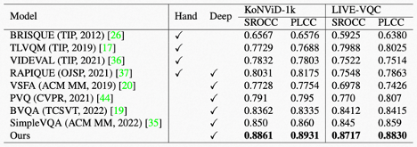 在两个开放获取的视频质量评价基准数据集KoNViD-1k和LIVE-VQC上,我们对现有最优方法进行了系统性比较。基于广泛认可的统计评估标准Spearman Rank Order Correlation Coefficient(SROCC)和Pearson Linear Correlation Coefficient(PLCC),我们对模型性能进行了量化评估。实验结果表明,在保序性方面,具有较高的SROCC值;在与标注分数拟合度方面,则表现出较高的PLCC值。如图所示