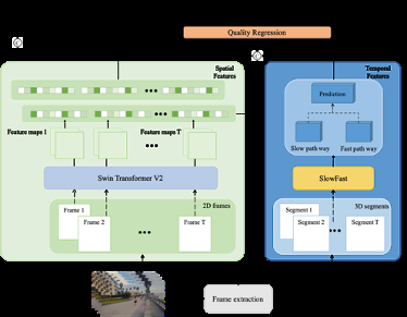在手机拍摄过程中产生的相机抖动会导致视频在时域上产生失真现象;此外,同样无法通过视频空域特征精确地进行描述。为了进一步提高模型性能,我们采用了预训练的SlowFast网络模型[7],通过该模型能够提取出视频片段级别的运动特性和空间特性,其中时间维度上的特性被定义为重要的时域特征表示,如图3所示