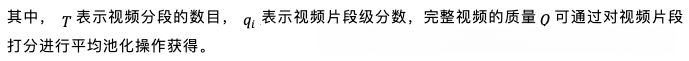 此外,在计算整体视频质量评分时,我们采用了基于时间序列的平均汇聚方法来整合各个视频片段的质量分数。如图5公式所示: