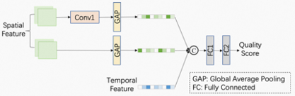 图1呈现了所提出的无参考视频质量评价模型的框架结构。该框架主要包含三个关键组件:即空域特征求取子网络、时序特征求取子网络以及时空融合回归子网络。详细而言,在空域维度上该系统主要关注图像的空间失真特性;而在时序维度上则着重于捕捉图像的运动特性;同时综合考虑运动信息对失真感知的影响后,在此基础上经过时空维度上的信息融合处理后,在此基础上采用回归分析方法将各子网络输出结果映射至最终的质量评估值Q上