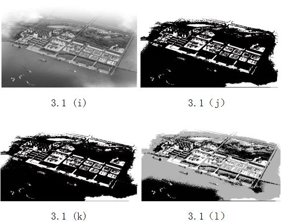3.1(i) 基础灰度基图 3.1(j) 单门限最大熵分割基图 3.1(k) 基于遗传算法优化的KSW熵单门限分割基图 3.1(l) 基于遗传算法优化的KSW熵二重门限分割基图