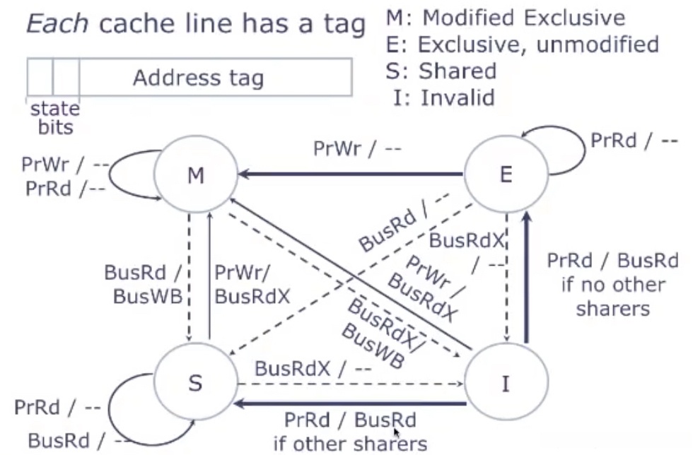 - Snooping-based protocols: All caches observe each other's actions through a shared bus. 所有缓存通过共享总线观测其他缓存的行为。