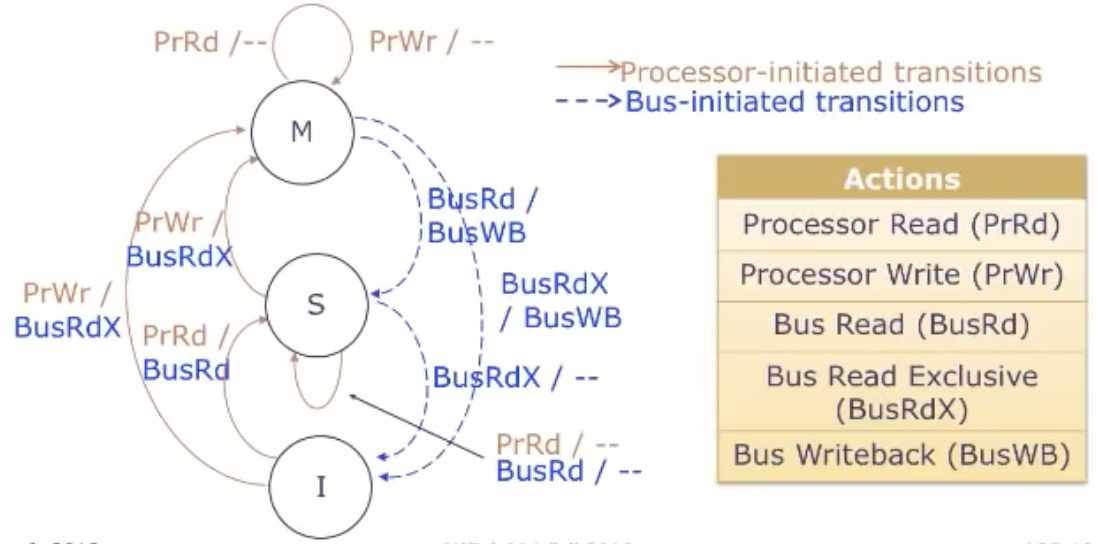 - M - only this cache has the address; hence it can be read and written - any other cache that had this address got invalidated “修改”状态表示cache可以对该地址进行读/写操作