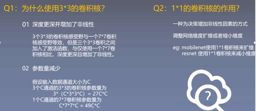 - 在于1:2-3层relu,比单个relu,有更强的分辨能力;在于2:减少参数数量:1个7×7conv:7×7*C**2,3个3×3conv:3×3×3conv。少了80%。(这可以看作是对7×7卷积滤波器进行正则化,迫使它们通过3×3滤波器(在它们之间注入非线性)进行分解。)