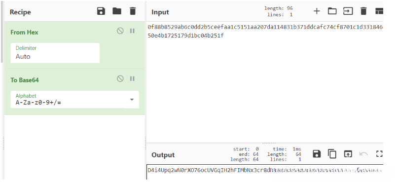 现在已经很清楚了。这一串十六进制字符串经过AES算法进行加密处理后得到了ASE密文与相应的密钥。这些密钥与密文都已经获取并具备解密能力。通过CyberChef工具首先将十六进制数据解析为ASCII字符,并随后将其进行Base64编码处理以完成整个解码过程。