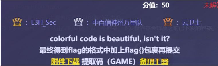 经过打印结果的分析后发现仅有前20组数据与其余部分存在差异;其余部分的RGB值完全一致;这使得我们能够联想到data1中的数字范围(0至19)正好覆盖了这里的前20组数据;因为对图片不熟悉程度较低;CTF题目练习不足;参考大神们的解题思路:我们可以将这20组RGB值按照data1中的序列依次进行赋值;最终通过PIL.putpixel()方法生成完整的图片;其中隐藏的信息即为flag所在位置
