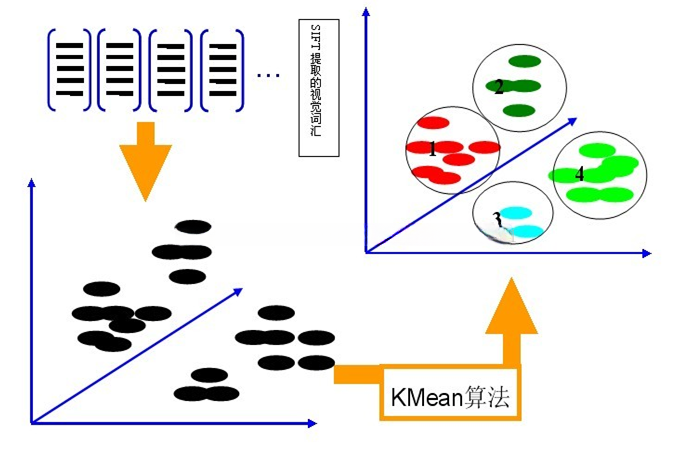 (2)从上一阶段获取的SIFT特征向量以及视觉词汇数据出发,在采用聚类技术(例如k-means算法)的基础上完成数据分类工作。研究者通过上述簇心集合构建Visual Vocabulary(Visual Codebook),并将其作为后续模型训练的基础输入。