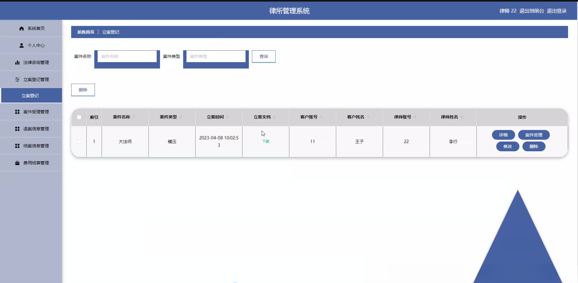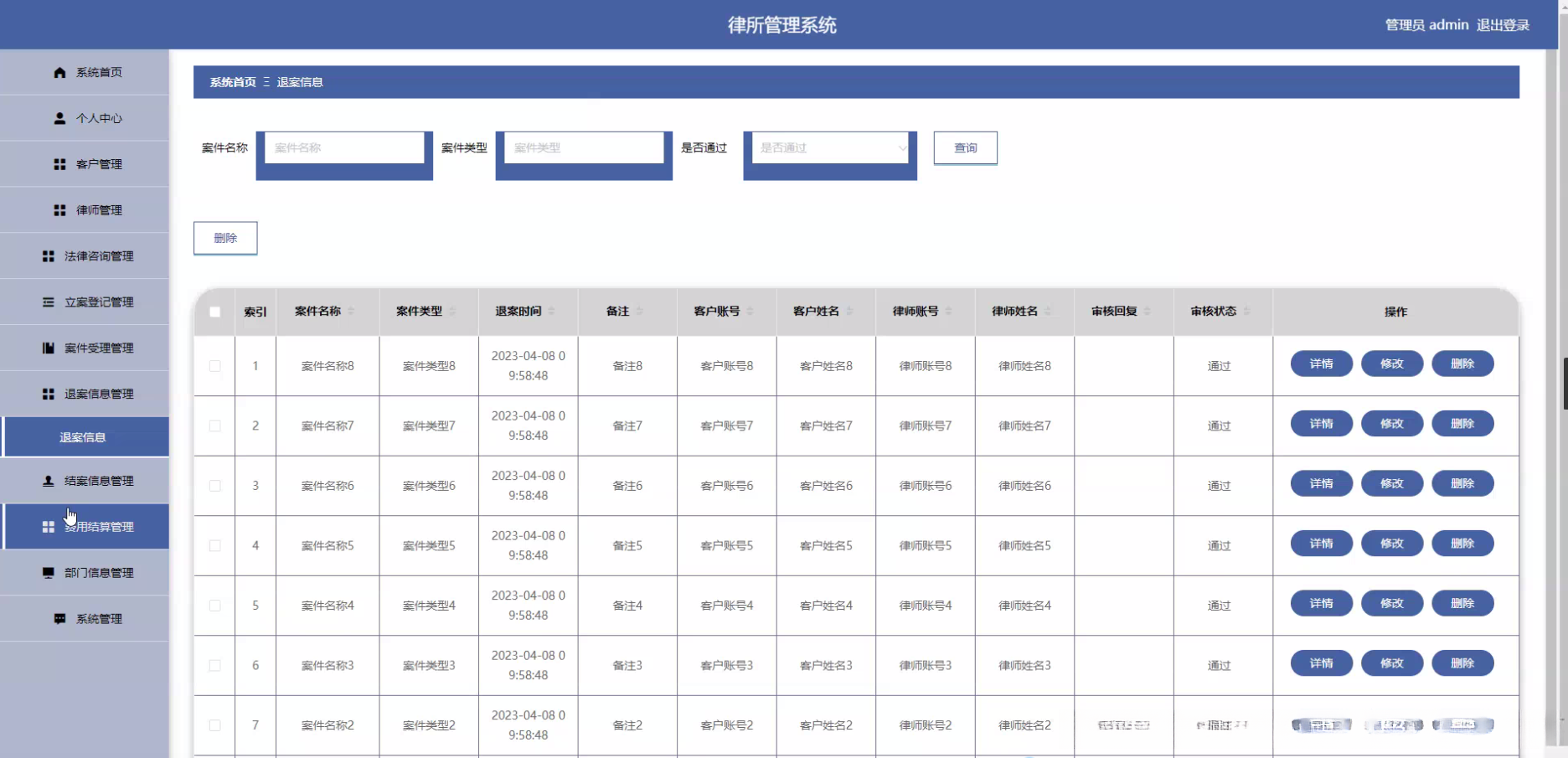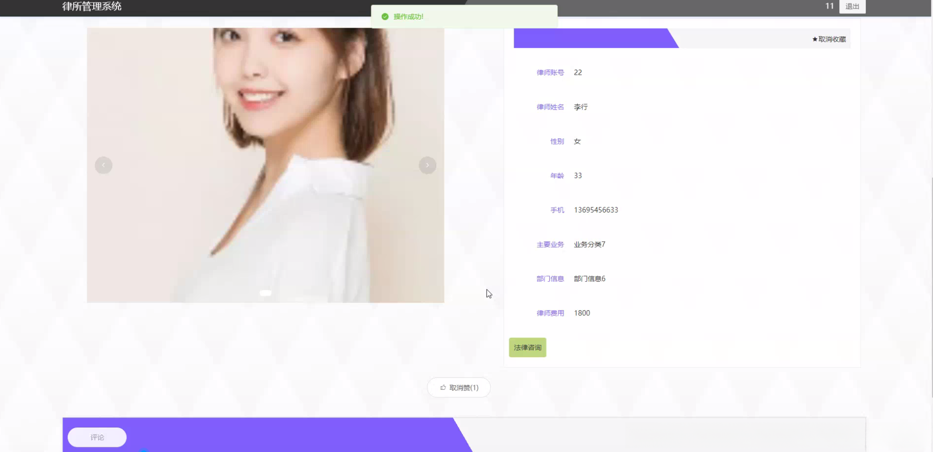 律师信息管理系统主要负责收集并整理律师的专业背景数据,包括执业领域、从业经验以及过往案例统计等关键指标