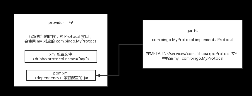 当一个provider启动时,它会将注册到我们jar包中的my=com.bingo.MyProtocol配置注入其中。随后,在你的配置文件中就可以直接使用这个自定义协议了。这种方法实际上就是替代Dubbo内部提供的组件,并通过简单的配置实现扩展性功能。