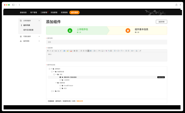 同时DataLab提供自定义组件集成服务,科学数据中心管理员可为算法工程师分配组件管理权限,管理维护组件目录并按照DataLab封装标准可快速添加组件。新组件经历试运行和审核环节,便可面向全体用户选取使用。