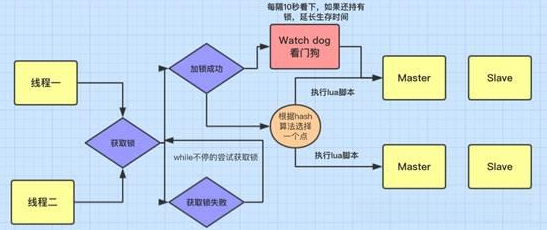线程去获取锁,获取失败: 一直通过 while 循环尝试获取锁,获取成功后,执行 lua 脚本,保存数据到 redis 数据库。