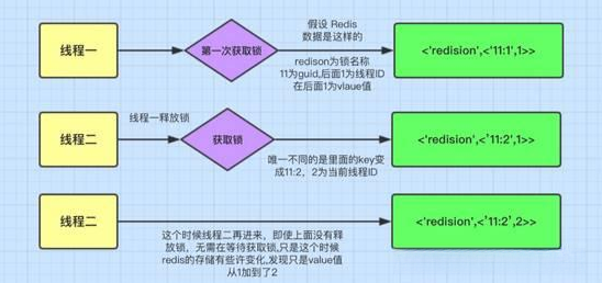 guid + 当前线程的 ID。后面的 value 是就和可重入加锁有关。value 代表同一客户端调用 lock 方法的次数,即可重入计数统计。