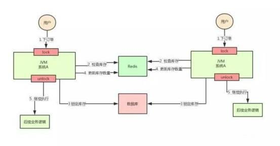 增加机器之后,系统变成上图所示,假设此时两个用户的请求同时到来,但是落在了不同的机器上,那么这两个请求是可以同时执行了,还是会出现库存超卖的问题。