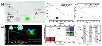 图 3 为无机盐涂层研究:(a) MAPbBr₃−NaNO₃ 的合成路线及其流程图;(b) 材料在不同热处理条件下的稳定性能对比分析;(c) 光电性能测试结果展示;(d) CsPbBr₃-NCC 基质纳米晶在不同加热-冷却周期下的 PL 强度变化曲线;(e) 复合材料制备所得样品的 PL 光谱特征及其发射模式分布情况;(f) 不同光照时间下样品 PL 强度随时间的变化规律研究结果。