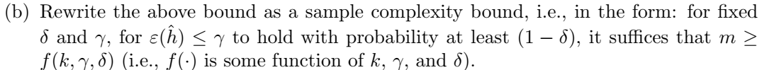 (b)据(a),\gamma=\frac{1}{m}log\frac{k}{\delta},所以m越大\gamma越小,with\ probability\ 1-\delta,\varepsilon(\hat h)\leq\gamma的界也就越小。根据m=\frac{1}{\gamma}log\frac{k}{\delta},所以m\geq \frac{1}{\gamma}log\frac{k}{\delta}