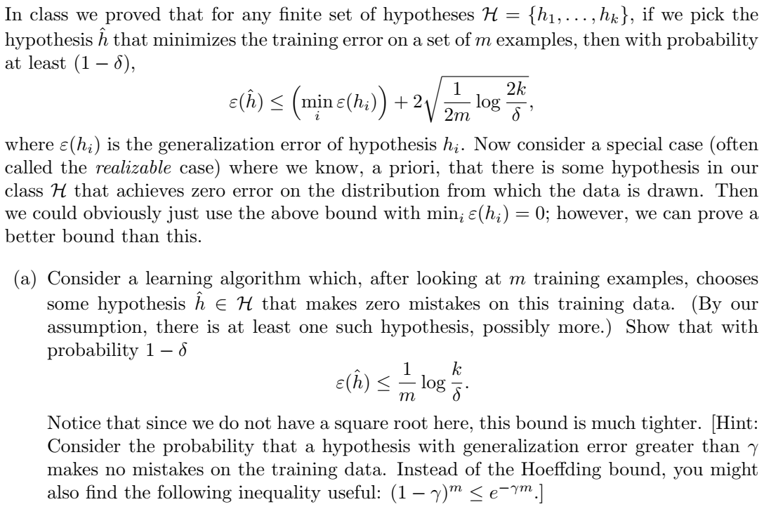 (a)根据题意,这些\hat h_i目前仅满足使得\hat \varepsilon(\hat h_i)=0,并不能保证\varepsilon(\hat h_i)=0。反过来也一样,如果存在h_i^*使得\varepsilon(h_i^*)=0,那么\hat \varepsilon(h_i^*)=0却不一定满足。因为根据讲义,\hat h_i与h_i^*并没有什么关系。此题需要证明的是,这些\hat h_i满足\varepsilon(\hat h_i)\leq\frac{1}{m}log\frac{k}{\delta}。题中的"some hypothesis \hat h"指的是\hat h_i,要求证明的不等式关系也只是针对\hat h_i,并不是所有的h\in\mathcal{H}。在讲义中\hat h定义为了\hat h=\argmin_{h\in \mathcal{H}}\hat \varepsilon(h),而h^*=\argmin_{h\in \mathcal{H}}\varepsilon(h)。