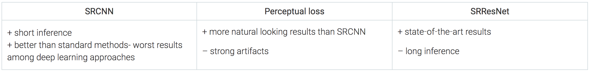 本文中,我们描述了用于单图像超分辨率的三种不同的卷积神经网络实验,下图总结了实验结果。