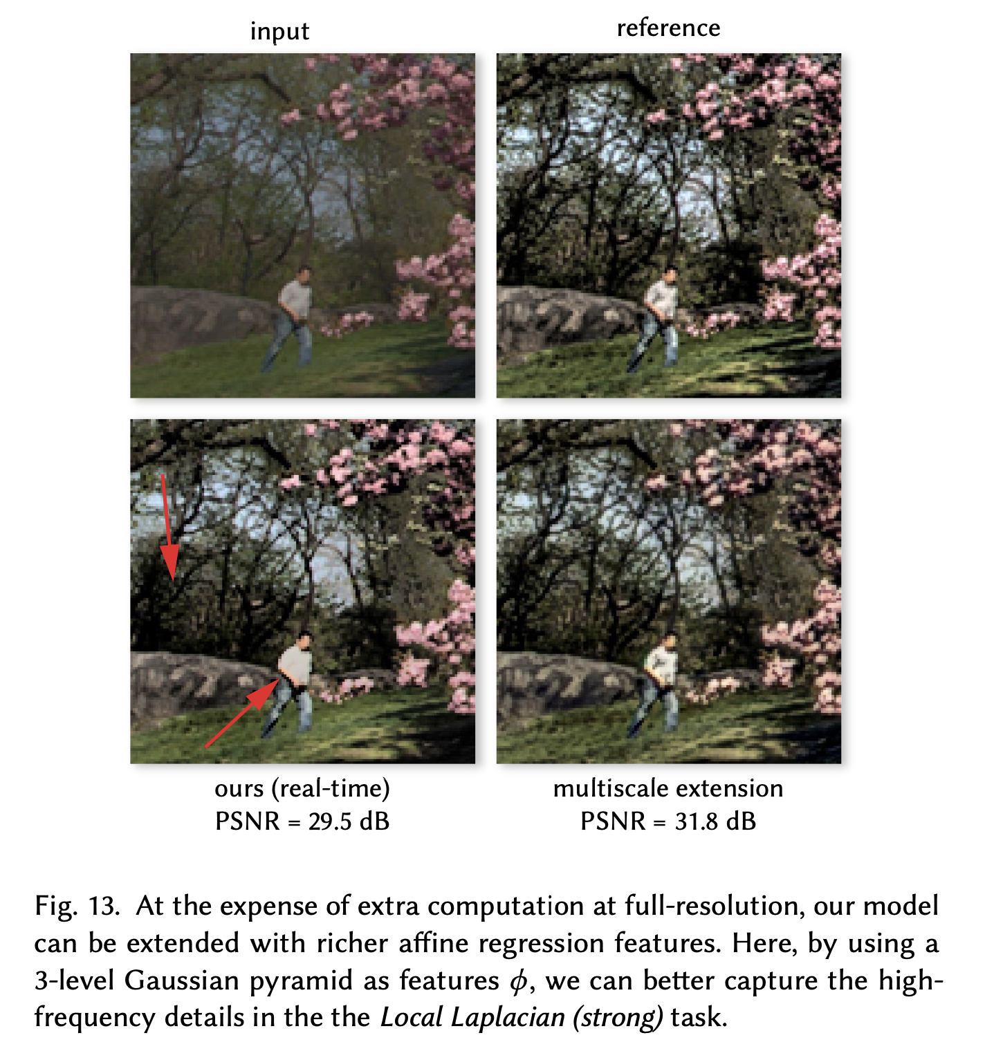 图13呈现了当我们在全分辨率下执行额外计算时该模型如何通过丰富仿射回归特性实现功能扩展的情况。在此处基于一个包含三级高斯金字塔构建的特征ϕ 该模型能够更加精准地捕获该任务中关键区域的高频细节