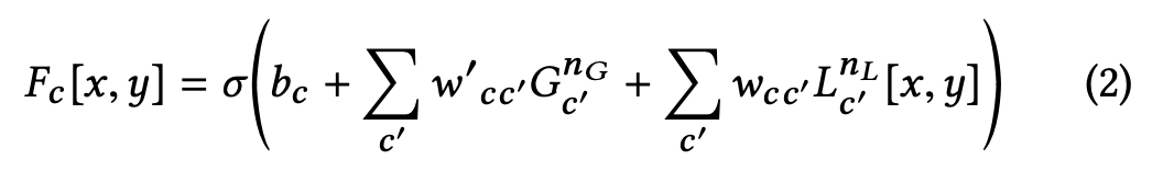 最后一位初级特征层Sns随后经由局部路径内的n_L=2个卷积层Li进行处理(图2所示区域为黄色)。这些层与公式(1)具有相同的结构,并通过设置L0=Sns来初始化参数。值得注意的是,在这种情况下步长s被设定为1。我们维持了局部路径中所保留的空间分辨率以及所提取的特征数量。由于空间分辨率得以维持不变,在这种情况下滤波器的空间支持仅随n_L呈线性增长。适当深度的卷积层堆叠对于捕获有用的语义特征而言至关重要[如Krizhevsky等人2012所述]。如果希望最终系数网格能够获得更高的空间分辨率,则可以通过减少n_S并相应增加n_L来实现这一目标;否则,在不降低网络性能的前提下可能需要保留较低的空间分辨率。省略局部路径会导致预测系数失去了任何空间位置的概念