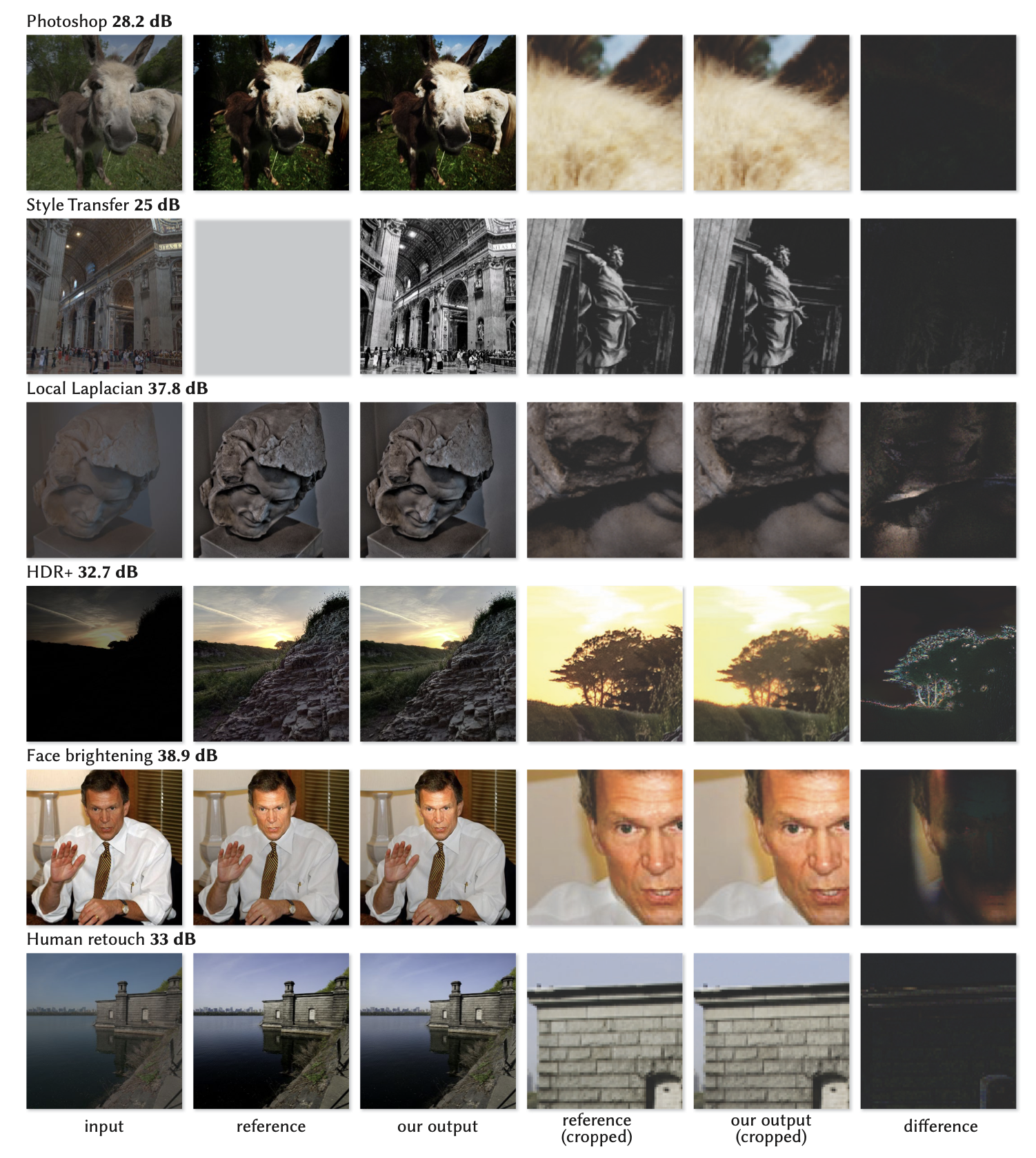 我们在七个基准测试应用中验证了我们的模型表现力:包括模拟发布状态下的图像滤镜(如Aubry等人2014;Hasinoff等人2016)、逆向解析黑盒Photoshop操作流程以及基于手动校准照片集[Bychkovsky等人2011]学习摄影师修饰风格的技术。与现有工作相比,我们的技术输出质量达到或超越了现有水平,并且适用范围更为广泛:无需依赖特定近似图像操作的实现基础(从输入/输出图像对中端到端学习),能够在移动设备上实现实时处理能力(处理全屏分辨率1920×1080像素的照片所需时间仅为14毫秒),并实现了令人满意的实时预览效果(50Hz)。我们的网络前向传递过程在Pixel手机上能够即时完成最高分辨率(1920×1080像素)的照片处理,并实现了令人满意的实时预览效果(50Hz)。