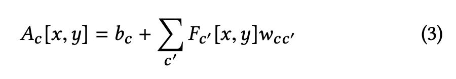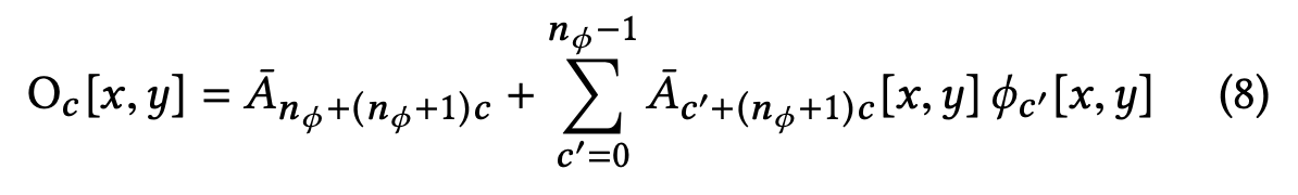尽管在处理整幅图像时需要考虑的操作可能相当复杂; 然而最近的研究表明即使面对复杂的图像处理流程也能通过一系列简单局部变换实现精确建模 [Chen et al. 2016; Gharbi et al. 2015; He and Sun 2015]。基于此假设我们假设每个输出通道 O_c 都可以通过全分辨率特征上的仿射组合来进行表示; 其中系数参数由切片特征图 ¯A 各通道决定: