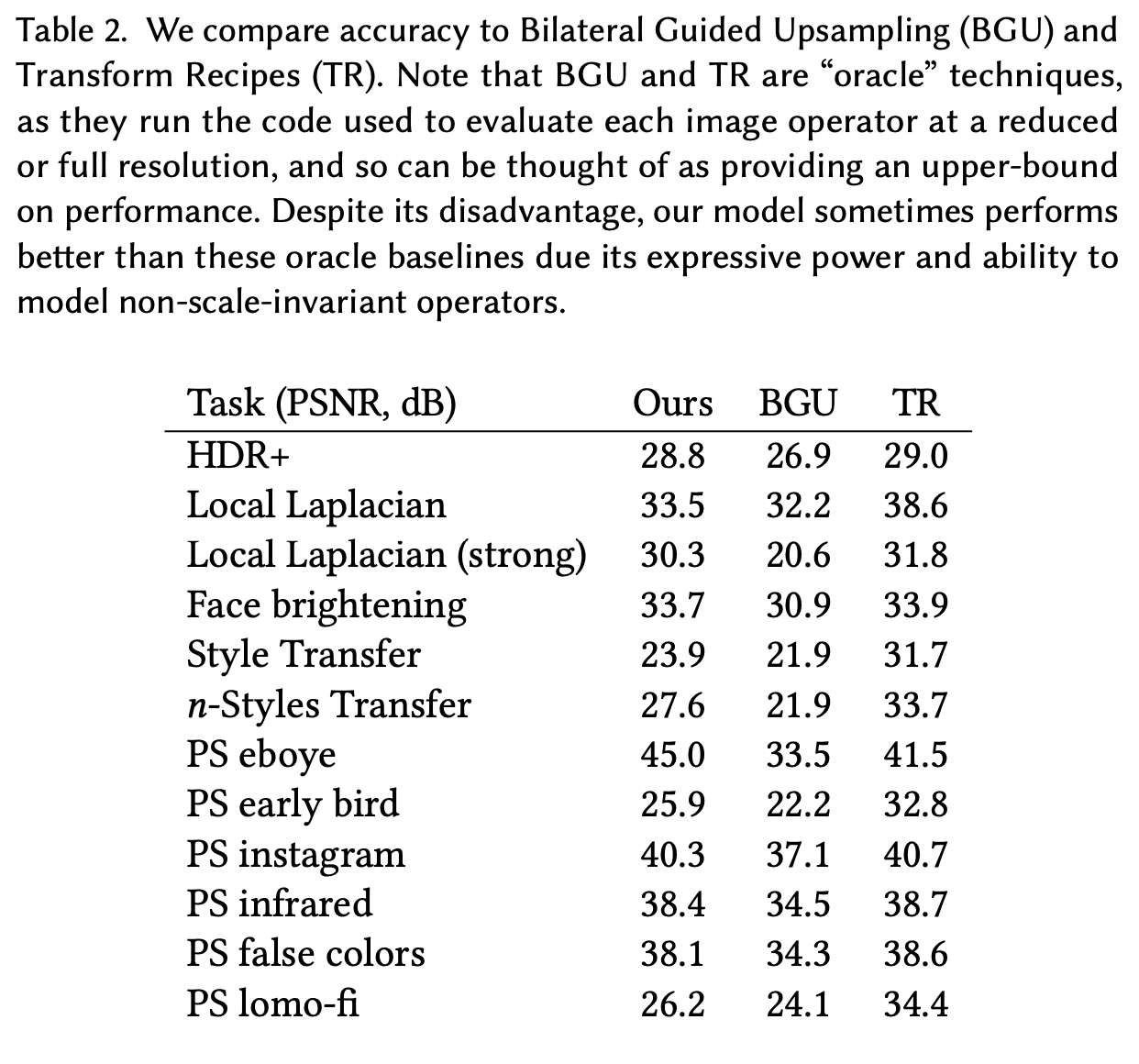 表2. 我们对比了我们的模型准确性和双边引导上采样法(BGU)及转换配方法(TR)。特别地,在低分辨率或全分辨率条件下评估每个图像操作符所需的代码时,请注意BGU与TR方法被视为性能上限。尽管性能略逊于这些基准方法,在某些情况下我们的模型仍能超越它们。这得益于其强大的表示能力和对非尺度不变操作符的有效模拟。