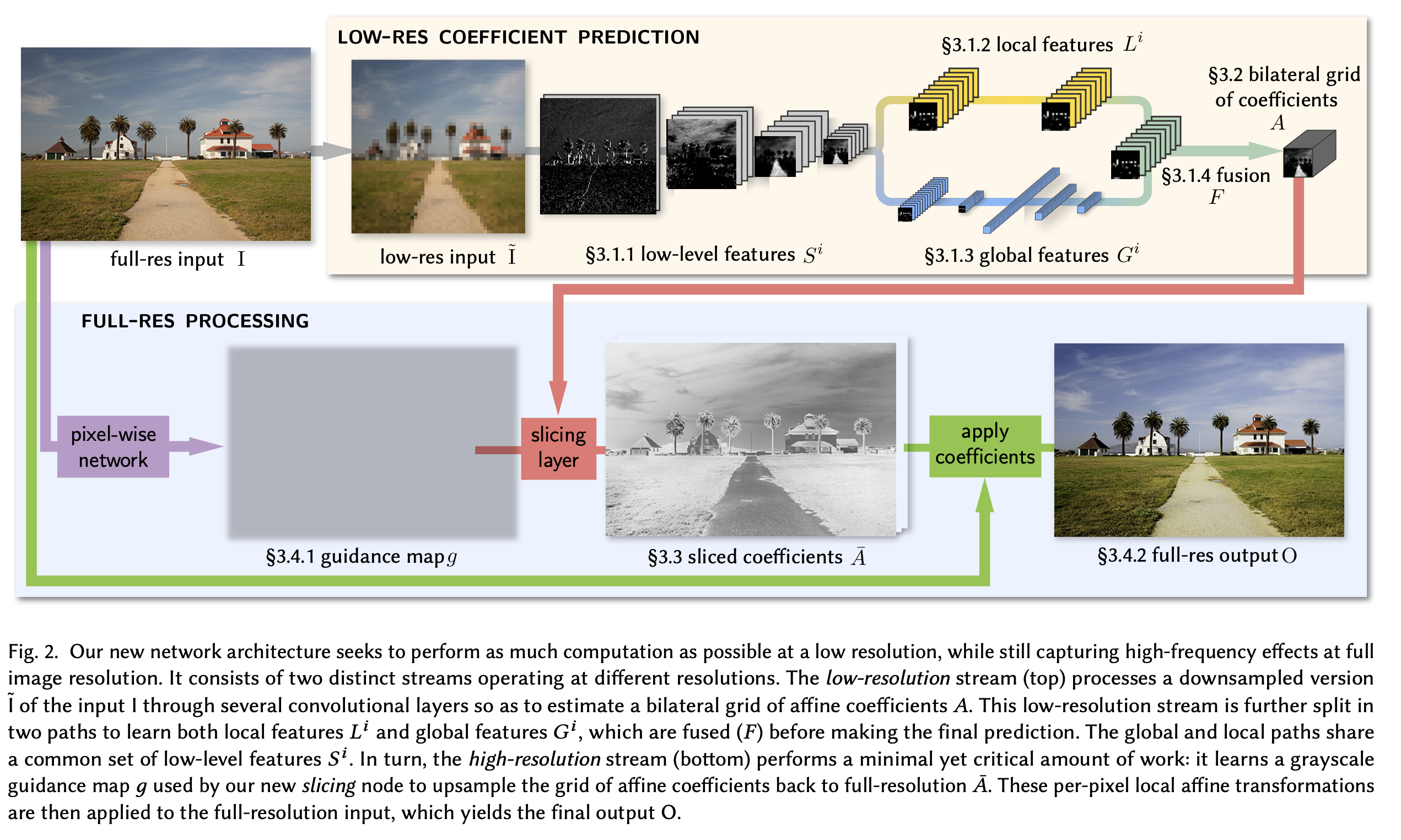 图2. 我们的新网络架构旨在尽可能地在低分辨率下执行计算,并且同时捕捉全图像分辨率下的高频效应。该架构由两个分别在不同分辨率上进行操作的不同分支构成。其中低分辨率分支(位于顶部)接收输入I的下采样版本˜I,并通过一系列卷积层估计出仿射系数的双边网格A。这一分支进一步划分为两部分:一部分专门学习局部特征Li,另一部分则专注于提取全局特征Gi,并在最终预测阶段将两者进行融合(标记为F)。值得注意的是,在这一过程中,全局特征分支与局部特征分支共享一组共同的基础低级特征Si。与此同时,在底部的高分辨率分支中执行了更为精简的核心运算:首先生成一个灰度引导图д,在此基础上将仿射系数网格进行上采样以适应全分辨率下的仿射变换操作¯A。随后通过对每个像素执行局部仿射变换操作并结合原始高分辨率输入数据进行处理后,则能够得到最终输出O