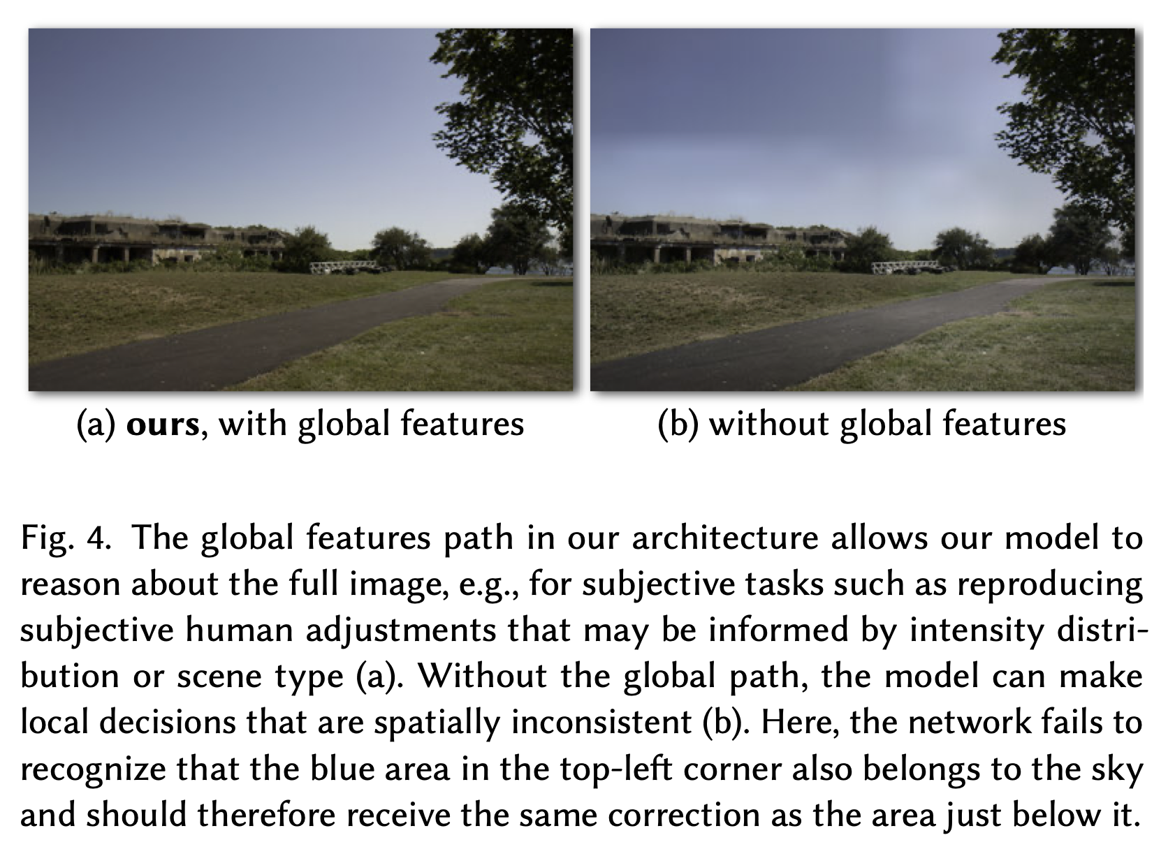 在低分辨率副本˜I中进行主要推理活动。这即是输入I在低分辨率流(图2顶部)中的表示。该系统最终预测出类似于双边网格的局部仿射变换[Chen等人的研究[2016]]。基于我们积累的经验教训,在图像增强方面不仅依赖于局部图像特性还应考虑到全局特性如直方图平均强度甚至场景类别等因素因此我们将低分辨率流进一步划分为本地路径与全局路径然后将这两个分支整合以生成代表仿射变换的最终系数