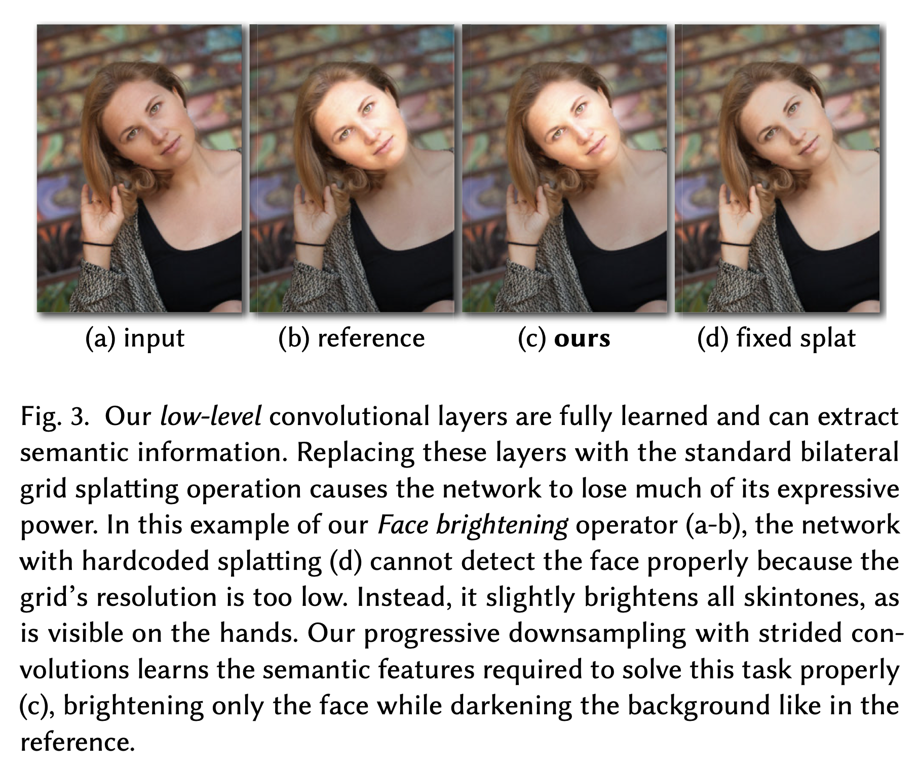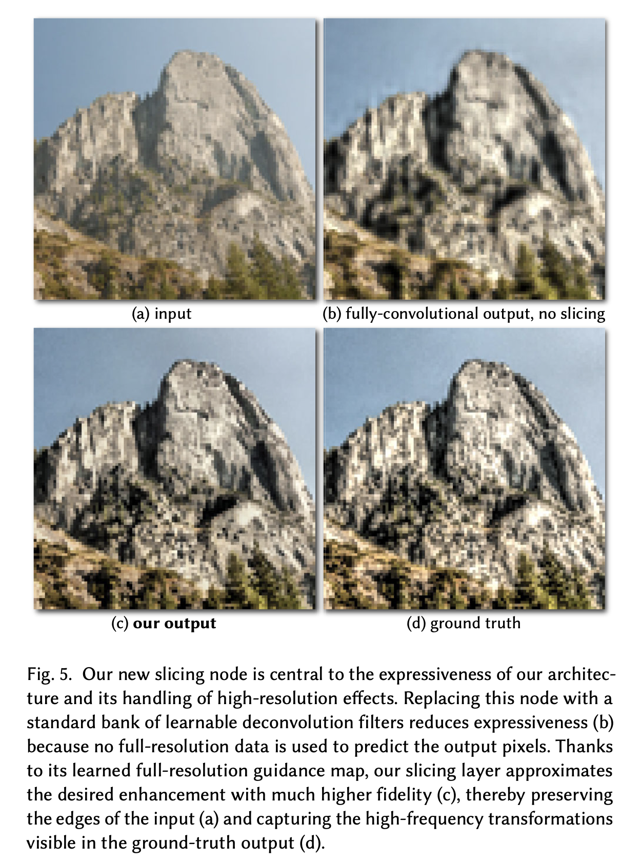 切片操作是无参数的,并且可以高效地在 OpenGL 着色器中实现 [Chen et al. 2007]。它作为一个瓶颈层,将神经网络的表示限制在低维空间中。这既简化了学习问题,也加快了处理时间 [Barron et al. 2015; Barron and Poole 2016]。关键的是,在双边网格内进行推理迫使我们模型的预测遵循g中的边缘,从而将我们的预测规范到边缘感知的解决方案(与基于转置卷积或“反卷积层”的标准网络不同,见图5)。这一设计决策倾向于有利于我们的摄影操作任务,并使我们在速度上比更通用的模型有显著提升,原因是A的低维度(见图10)。