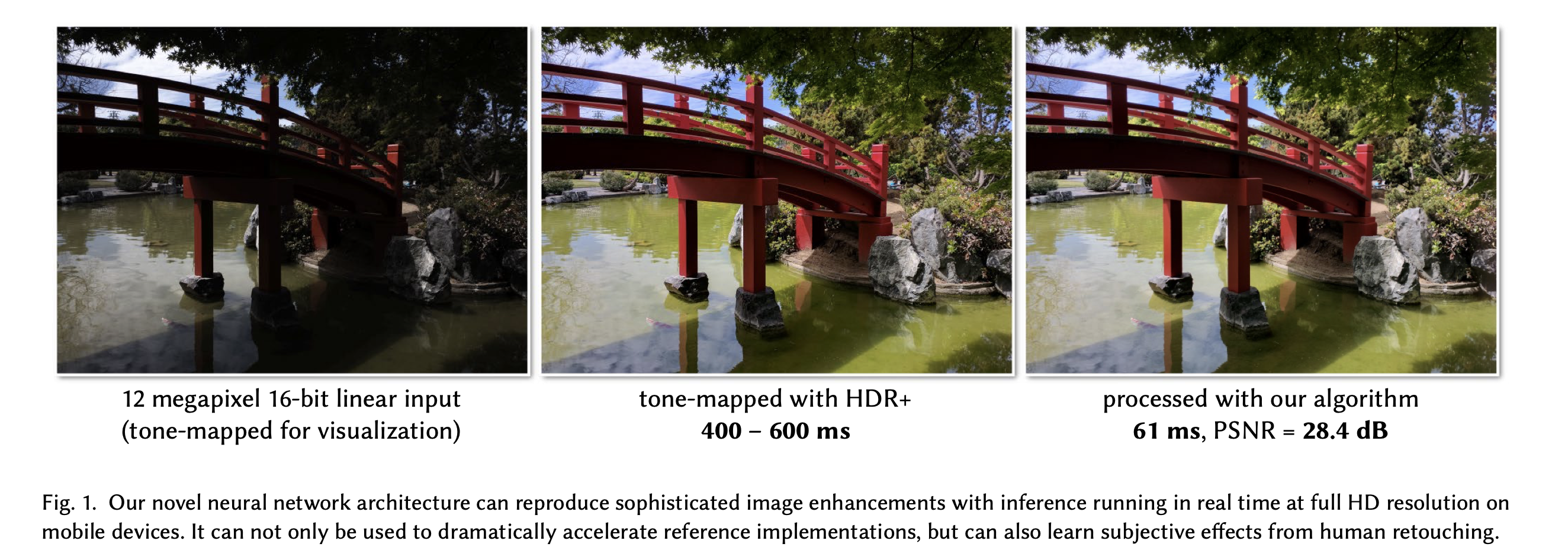 性能在移动图像处理领域是一个关键挑战。无论是基于传统图像处理方法抑或是人工精修的图像对,我们旨在恢复这些图像增强后的视觉效果,并实现即时处理。为此,我们参考了双边网格处理与局部仿射颜色变换的概念,开发了一种新型神经网络架构。该架构基于输入-输出图象对,通过训练卷积神经网络来模拟所需的视觉转换。具体而言,我们的模型能够做出局部、全局以及内容相关的决策,从而近似所需的各种图象转换效果。值得注意的是,当将低分辨率版本的输入图象送入神经网络时,我们将生成一系列双边空间中的仿射变换参数;随后我们采用一种新的切片节点来保留边缘信息并进行上采样;最后将这些上采样后的变换应用到全分辨率图象上以完成最终转换过程。该算法具备高效的计算性能特点,能够在智能手机端快速处理高达1080p分辨率的画面;同时在复杂图形操作任务中表现优异,其输出质量可与当前最先进的近似技术相媲美