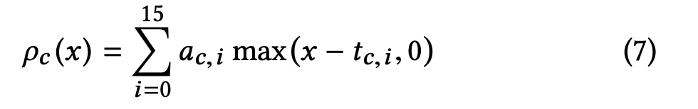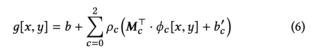 其中,在3×3颜色变换矩阵中存在若干行用于特定的颜色操作。在图像处理领域中这类矩阵常用于颜色校正其目的是匹配目标色彩空间并纠正色调偏差。b与b_c’分别代表偏差项。ρc被定义为分段线性传递函数具体而言则是16个缩放后的ReLU激活单元之和每个缩放后的ReLU激活单元均包含了相应的阈值t_{c,i}以及斜率a_{c,i}。