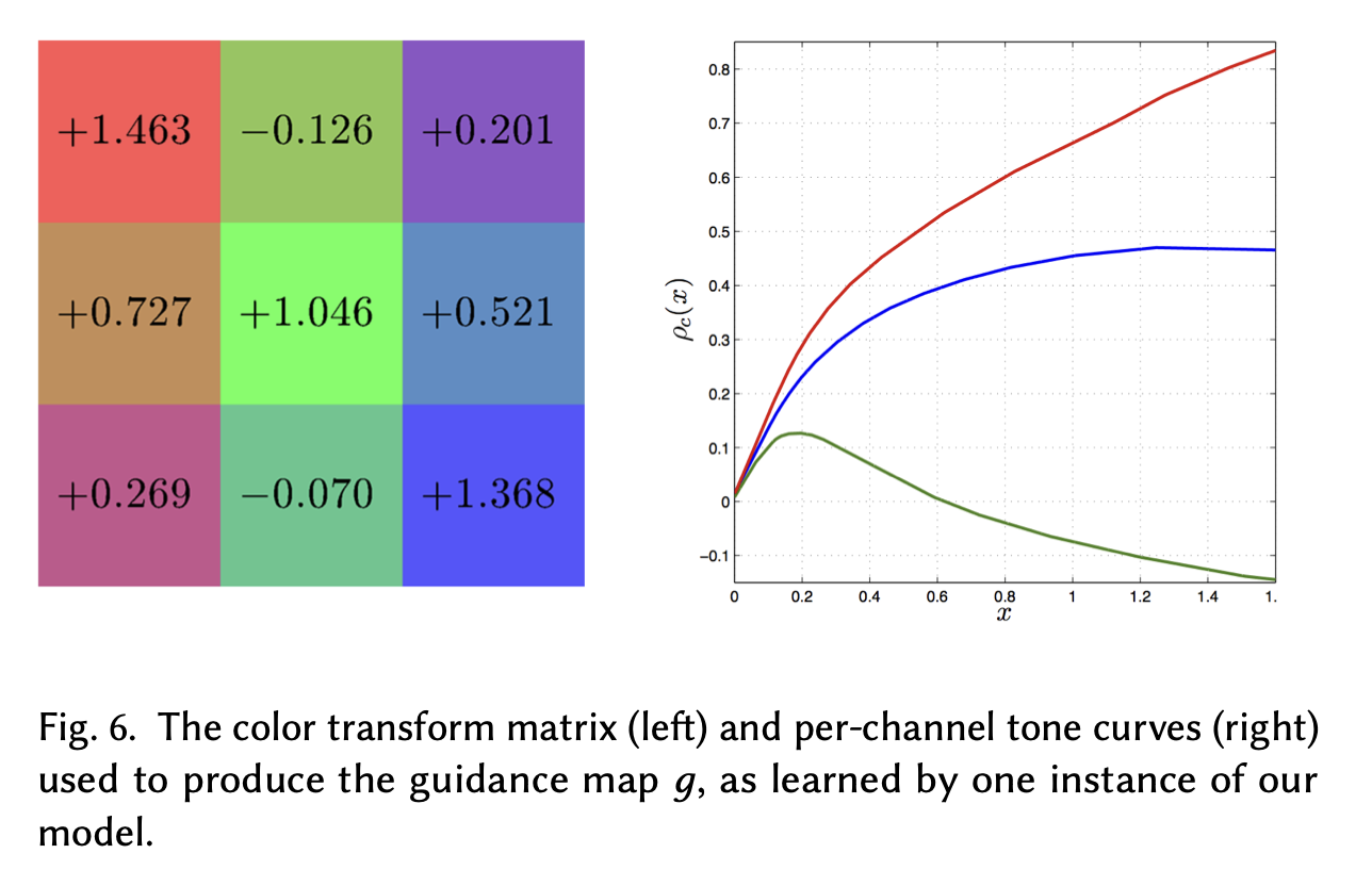 图6展示了该实例所掌握的颜色转换矩阵(左侧)以及每个通道的色调分布曲线(右侧)。这个模型能够有效地创建引导图g所需的视觉信息。