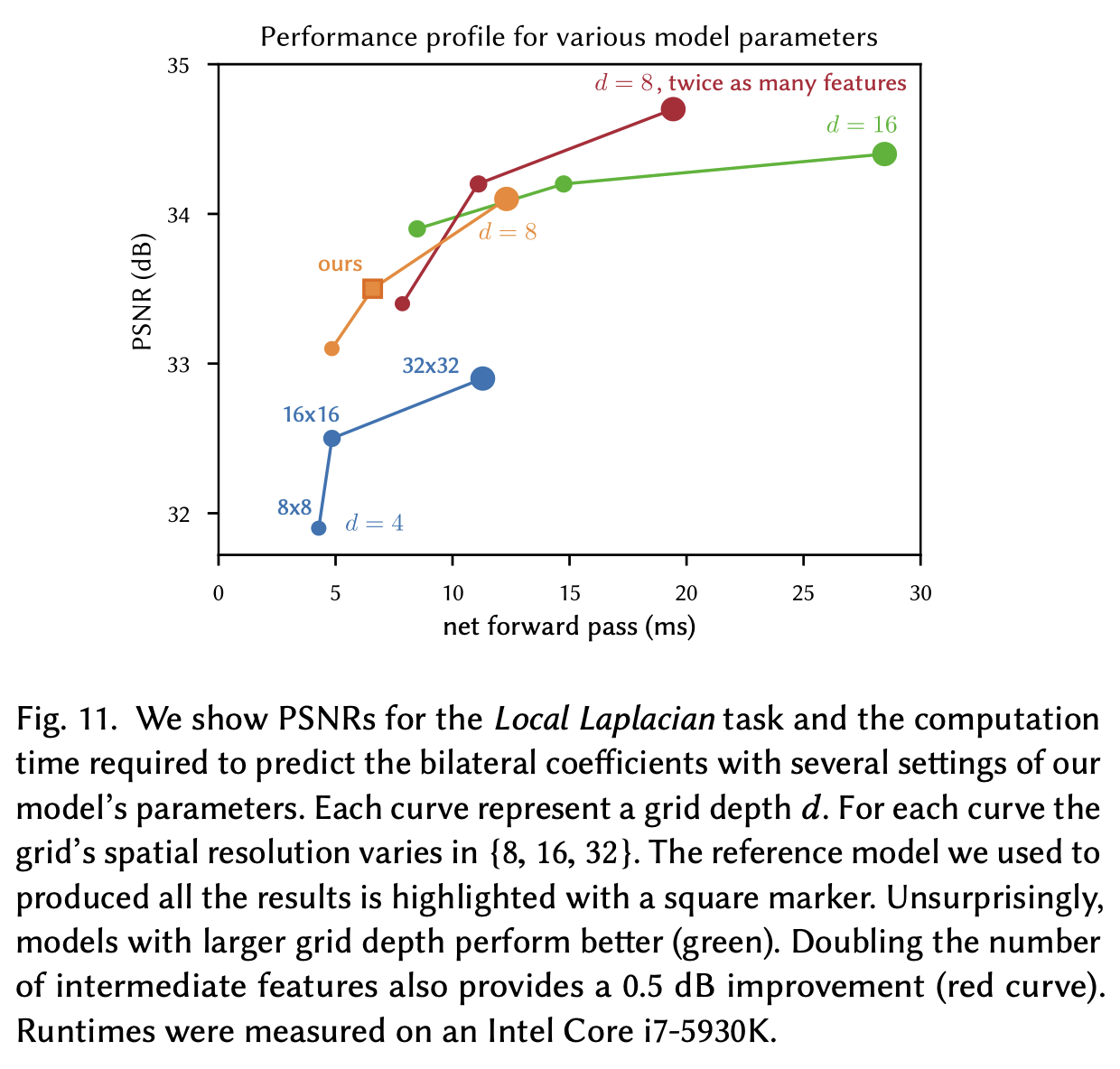 图11展示了局部拉普拉斯任务中的PSNR值以及预测双边系数所需的时间。这些数据源自我们模型采用的不同参数设置。每条曲线对应一个网格深度d,在此情况下其空间分辨率分别取值为8、16和32单位长度。作为基准对比的研究对象,则是以方框标记突出显示的研究模型用于生成所有结果。如预期所示,在更大的网格深度下取得更好的效果(绿色线条)。增加中间特征的数量可带来约0.5 dB的进步(红色线条)。所有时间均在Intel Core i7-5930K处理器上进行测量。