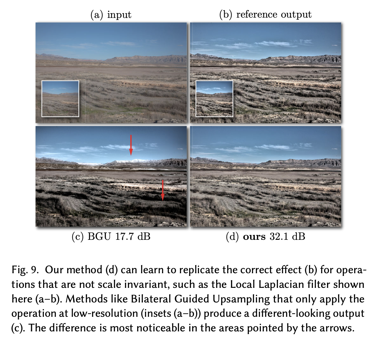 BGU假设图像操作符作用于输入的低分辨率版本,并随后将模型拟合至该低分辨率输入与输出配对。由于HDRI滤波器处理能力受限于其工作基准,在此前提制下难以有效执行高动态范围校正操作。因此转而采用全分辨率输入与输出配对进行处理,并通过下采样生成相应的低分辨率版本来供BGU处理。针对可实现的本地拉普拉斯变换与风格迁移任务,则采用了更为系统化的流程:a systematic approach dedicated low-resolution processing for these specific tasks.a marked enhancement in performance becomes evident (see Figure 9).
