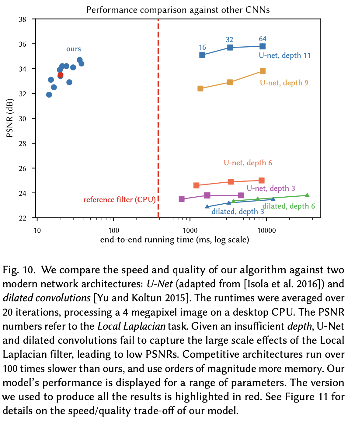 图10展示了我们算法在速度与质量方面的对比分析结果:它与两种现代网络架构进行了系统性对比:一种是源自[Isola et al. 2016]改编的U-Net架构;另一种是基于扩张卷积(dilated convolutions)的设计[Yu and Koltun 2015]。实验数据基于在桌面CPU上处理4,000,000像素图像完成20次迭代后的平均时间计算得出。其中所提及的PSNR数值指标反映了模型对局部拉普拉斯特征捕捉的能力。由于模型深度不足的问题,在捕捉大尺度效应方面存在局限性;因此导致PSNR值相对较低。相比之下,在速度上竞争对手快了一个数量级以上;并且内存占用高出一个数量级以上;同时这些结果还涵盖了不同参数设置下的性能表现情况:其中红色版本即是我们所有实验中采用的标准参数设置下得到的结果图形展示;详细讨论了速度与性能权衡关系的部分则见于图11
