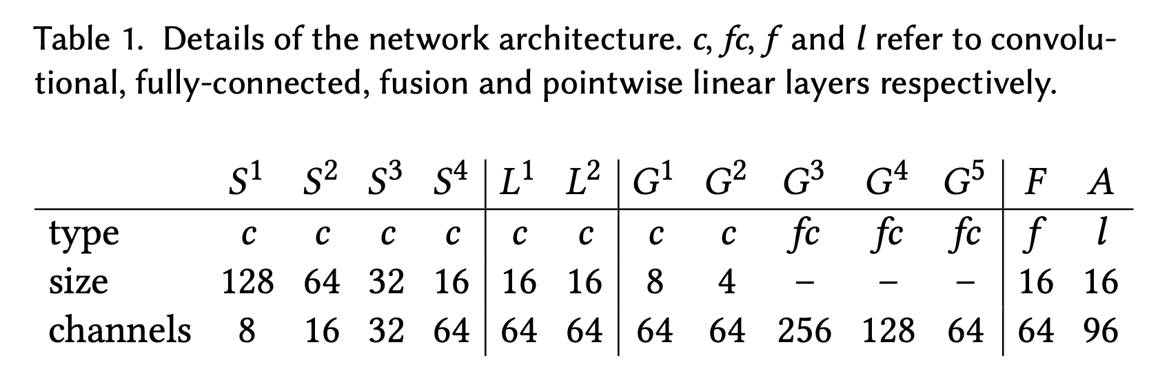 这些基本层逐步减少了总空间维度的一个因子2ns,在这种情况下有两个结果:第一种情况是它促进低分辨率输入~I与最终仿射系数网格的空间降采样;当ns值越大时, 最终网格越粗糙; 第二种情况是ns决定了预测的复杂性:越深层的层不仅具有更大的空间支持(呈指数级增长),还通过组合效应实现了更复杂的非线性;这样它们就能捕捉到输入中的更复杂的模式;图3展示了如果移除较深层的那些结构并替换为硬编码splatting操作(引用Chen等人2007年的研究),则网络的表现力会受到严重影响;我们采用了使用ns=4个基本层的设计方案;表1列出了各层次的具体维度