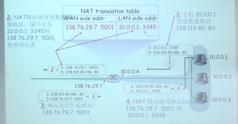 1.实现内网地址的转换,e.g.在下图中,10.0.0.1等是这些主机在内网中的地址,如果他们拿这个地址进行回转,路由器是识别不出来的。∴在他们想往外发分组的时候,需要进行地址转换,即将内网地址转化为外网地址,在这里所有数据报的IP地址都会换成138.76.29.7(但是具有不同的端口号)。
