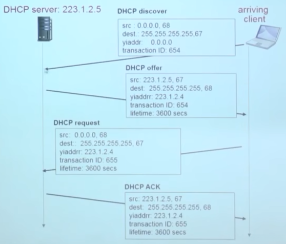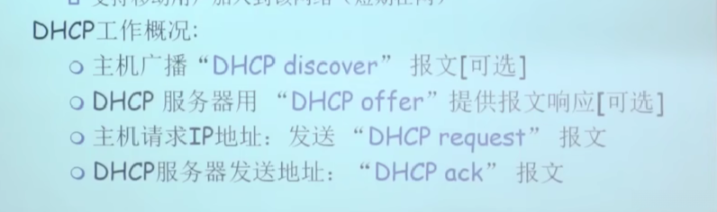 在用户到达网络的时候(∵这个时候这个主机还没有IP地址,∴用全0表示本主机),向网络内的所有主机广播“我到了”(通过全1的IP地址广播),然后服务器就会回应该客户空闲的IP地址(∵有可能不止一台服务器回复了空闲的IP地址,∴客户要决定用哪一个IP地址),于是客户要再给服务器发报文指明它要哪个IP地址,然后DHCP服务器就将这个IP地址、第一跳路由器的IP地址和DNS域名服务器的IP地址分配给这个客户,并回复ACK。