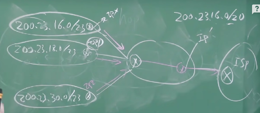 3.在下图中,左侧是上面提到的8个子网,每个子网的子网号都是23位的,然后每个子网通告他的下一跳路由器它的子网号,(e.g.第一个子网通告路由器子网号是200.23.16.0/23的分组发给“我”);然后中间网络中的路由器聚集来自8个子网的子网号,发现他们的前20位是一样的,∴这个时候该路由器将他们的子网号聚集成200.23.16.0/20,通告它的下一跳路由器子网号是200.23.16/20的分组发给“我”。