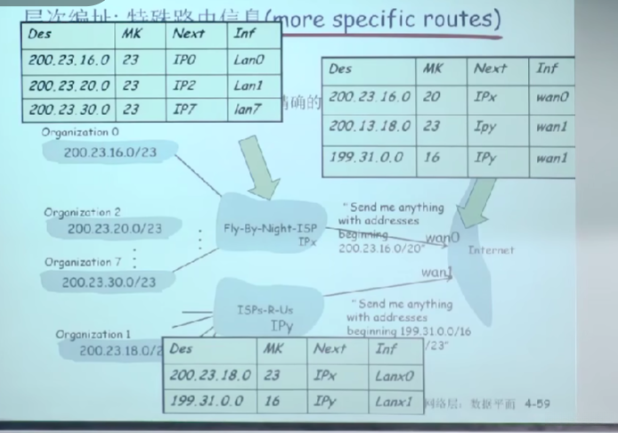 (扩展)这种情况下,如果有一个IP地址为200.23.18.7的分组到达Internet,那么这个时候Internet会将其与路由表中的子网掩码逐一“与”直至发现与目标地址子网号一样的表项(在这里是转发到IPx),然后IPx再重复上述操作,将该分组转发到Organization1.