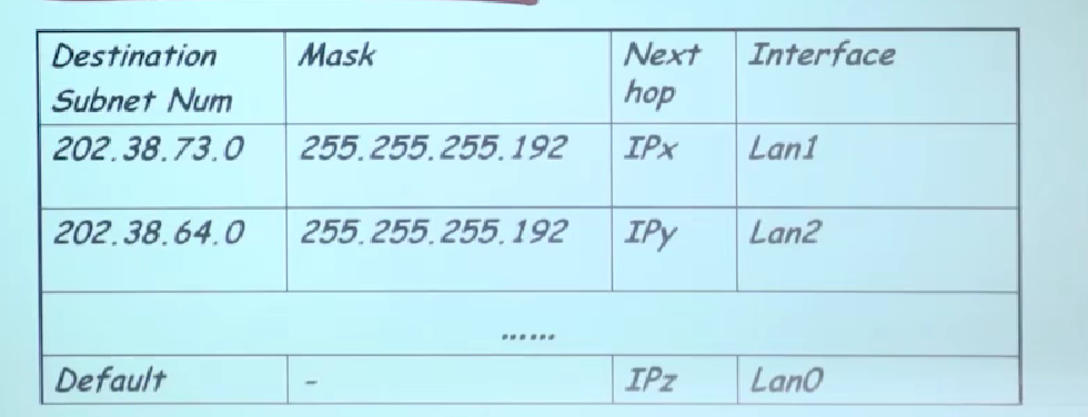 网掩码与目标IP地址进行与操作?请看下面的转发表,当分组从某个网络接口到达路由器时,路由器会拿该分组的目标IP地址和转发表中的子网掩码逐一进行与操作,如果与出来的目标子网号与转发表中的目标子网号一致,那就将该分组按照这一行对应的接口转发到这一行对应的Next hop,即下一跳;否则就继续与下一行的子网掩码进行与操作,如果都没有找到,则使用默认表项~默认网关转发数据报)