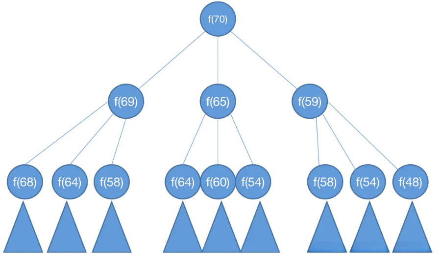 在处理f(70)的计算时, 我们需要逐一分析最后一枚硬币取值为1元、5元和11元的不同情形, 而这些子问题进一步分为三个部分, 逐层展开讨论。这样的算法其时间复杂度呈指数增长(O(3ⁿ)), 显然是一种低效的方法。